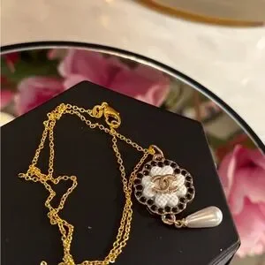 Chanel stamped Gold and Black Pendant Zipper Pull w drop Pearl