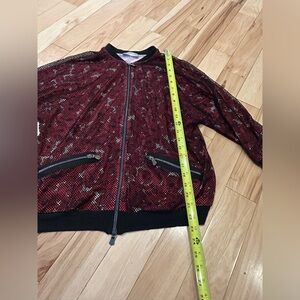 Anatomie Red Petal Poppy Floral Bomber Jacket with Black Mesh Overlay - Women’s Size Medium - full zipper front with zippered pockets - made in Italy - pre-owned, great condition. See photos for tags, condition and approximate measurements (to confirm fit).