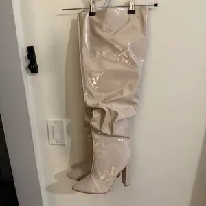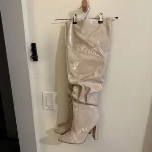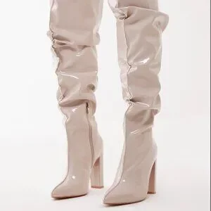 These Cream Vinyl Over-the-Knee Block Heel Boots from PrettyLittleThing are a bold and stylish statement piece. Perfect for nights out, events, or elevating any outfit!