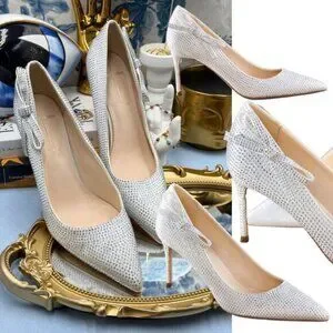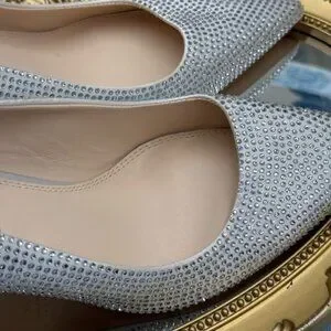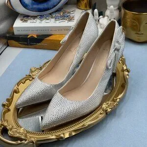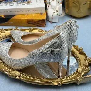 🆕 BLACK SUEDE STUDIO 🧿 NWOB White Satin Ribbon Rhinestone Heels, Sz 37 US 6.5
