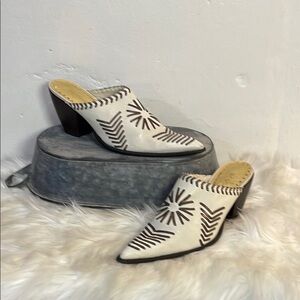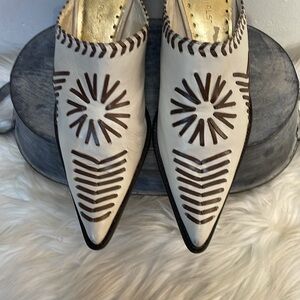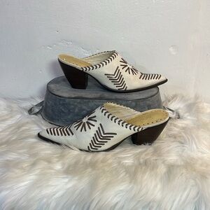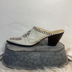 These western inspired mules from BCBGirls showcase a sophisticated blend of off white and brown hues, crafted from textured leather with a unique laced stitched design. The pointed toe and medium-height heel offer a sleek and elegant silhouette, perfect for elevating any outfit. Slip into these stylish shoes for a comfortable and fashionable look.