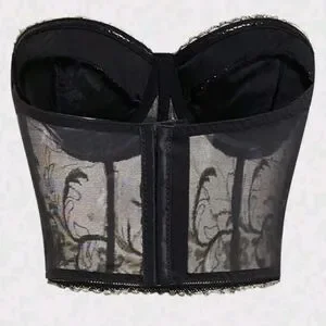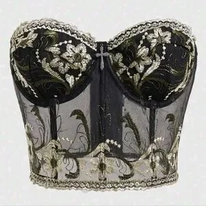 Chic black bustier with intricate gold embroidery. Perfect for a stylish evening look.