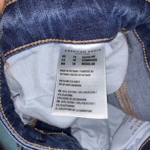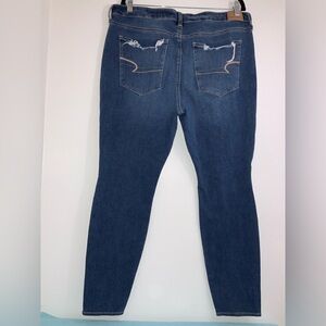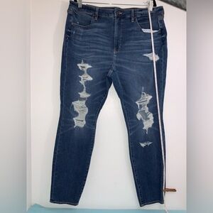 Stylish distressed women's jeans in a classic blue shade. Perfect for a casual, trendy look.
