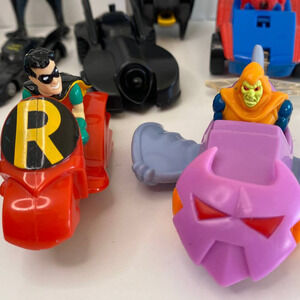 Great collector set for any Marvel and DC Comic fans! Most items are vintage Happy Meal Toys. One Batmobile has a release that shoots the car forward. The Batman figure has a detachable expandable wing backpack.