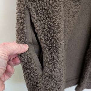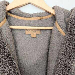 Soft and cozy hooded vest in cocoa brown color.. Perfect for layering...open front .. 2 deep hidden side pockets..lightweight and super soft on..some pilling on inside just from wearing over other tops..100% polyester..chest measures 20".. length is 29".. Size S