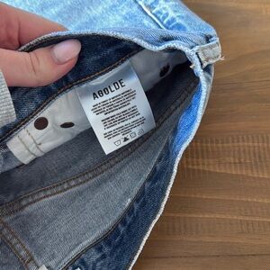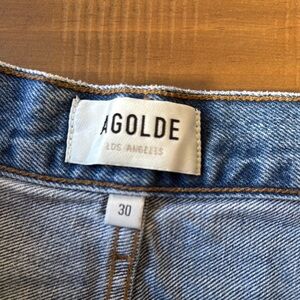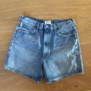 Classic blue denim shorts by AGOLDE. Features a zipper closure and front pockets.