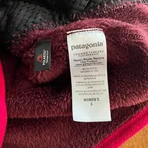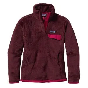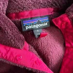 Patagonia "Re-Tool Snap-T Pullover" in women's size Small. Rich plum or raisin burgundy red-purple color with magenta pink accents at the pocket flap, collar and cuffs. Super cozy for layering with large mesh kangaroo pocket. Style #25442. VGUC; slight wash wear and minor wear the cuffs and hem.
