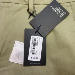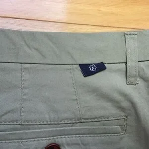 Details: Light earthy green color with 2 slash pockets, 1 button coin pocket and 2 button close back pockets. Zipper fly with button and 2 hook and eye closure. Soft, lightweight chino khaki fabric