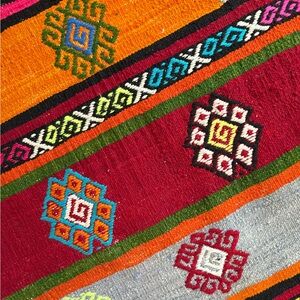 Bought in Istanbul. Vintage rug with modern bright colored embroidery also done in Turkey. Great for a huge room. Statement piece.