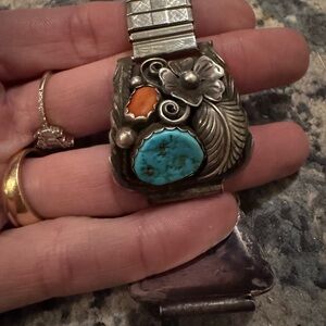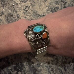 Turquoise and Coral Silver Watch Band has an old pawn look to the nuggets of coral and turquoise with feather accents and flowers