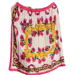 This is a vintage pleated midi skirt in pink with purple, gold, and green accents. It is designed for women in size Large, featuring a floral Versace like -themed style.