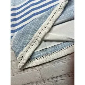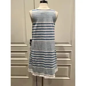 This is a blue and white striped dress by Vineyard Vines it is fully lined and has a beachy boho fringed hem. Linen Cotton blend with 100% cotton lining Size 8, fully lined with side zipper. Pre-owned, but in excellent condition with no visible flaws.