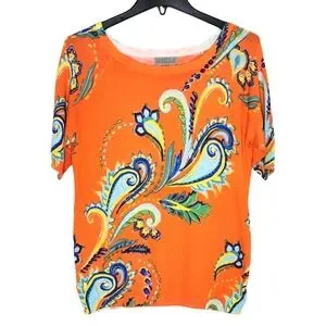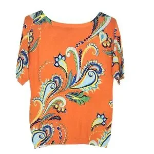 Joseph A Sweater Women Size M Orange Multicolor Paisley Short Sleeves