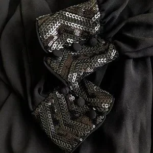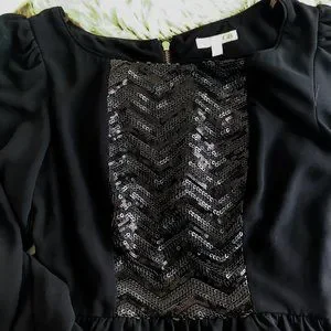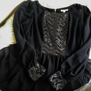 This dress combines classic black chiffon with eye-catching sequins in a chevron-inspired center panel. The sheer long sleeves give it a romantic, elevated feel, while the fitted waist and flowing hi-low skirt create a beautiful silhouette with movement. The cuffs feature matching sequin embellishments and a three-button closure for extra polish.