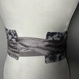 Purple printed Sash has ribbons in a lighter dusty purple color. The main part of the belt is 25", 86" in total length.