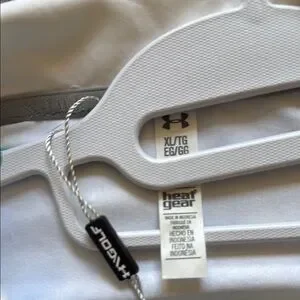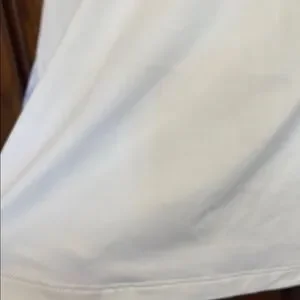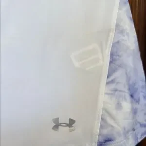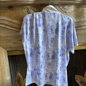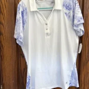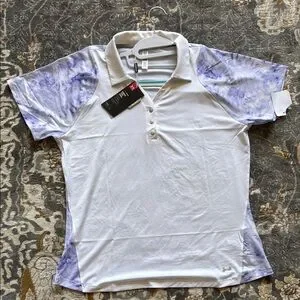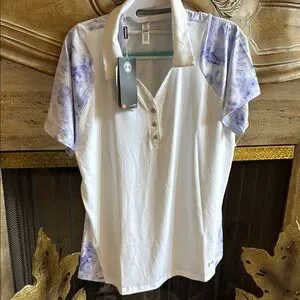 Stylish white polo shirt with purple tie-dye sleeves. Features a button-up collar.