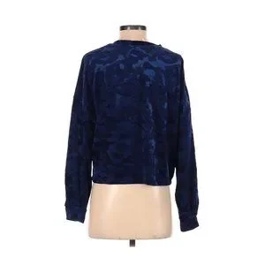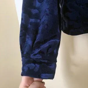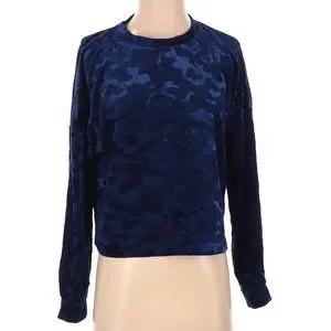 This long sleeve top features a classic crew neckline, dropped shoulders, and a blue-on-blue camo design that adds dimension without being overwhelming. The velour fabric has a soft sheen and a comfortable stretch, making it ideal for casual wear, loungewear, or pairing with denim for a stylish cool-weather look.