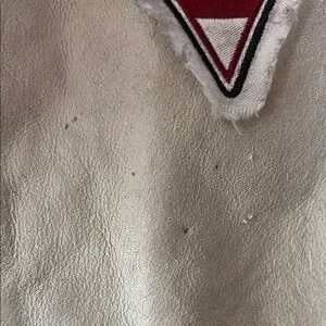Photos of slight snag in the lining and tiny holes in front leather under one patch.