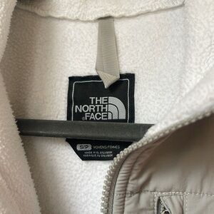 Cozy fleece jacket by The North Face. Features a stylish gray and white color scheme. Perfect for chilly days. In good condition - some pilling/ light stains noted on pictures given it is a few years old.