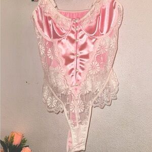 This elegant pink lace bodysuit features delicate lace detailing and a satin finish, perfect for adding a touch of luxury to your intimate collection.