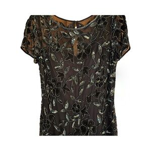 This stunning Petite Adrianna Papell gown has a sheer overlay adorned with shimmering sequins, making it perfect for mother of the bride or a wedding guest. It features a crew neck and short sleeves. Very flowy and graceful. Hemmed to fit 5’1” I’m heels. Excellent Used Condition.