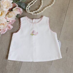 This Baby Girl's Diaper Set is Precious. The angelic white base has a sweet pink Ric Rac trim around the neckline, arm and leg openings. The chest has an adorable hand-embroidered hand-shadowed bird done in pink. More embroidered details are done in green, yellow, red and blue. Super Cute!! The back has a button closure and the diaper cover has an elastic waist and leg openings. Poly Cotton blend for easy care. New With Tags!! Perfect for SPRING!!