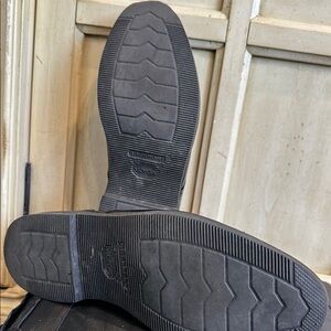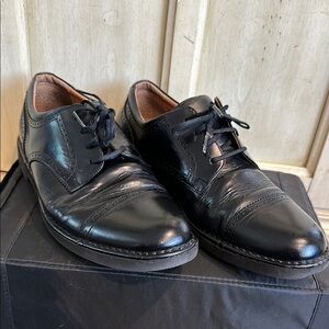 These black leather oxford shoes feature a polished finish and a classic closed lacing system. The rounded toe cap and smooth leather material offer a timeless look, while the dark-colored sole ensures durability. Perfect for formal occasions, these shoes combine elegance with comfort. Photos show any defects on the shoe. Shoes are in good used condition.