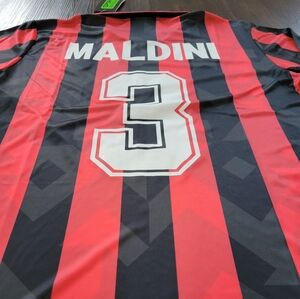 This is a new men's retro long sleeve soccer jersey for Paolo Maldini of AC Milan, made by Lotto. The jersey is designed with a multi-color palette and features the team's logo prominently on the chest. It is a Men's size and has a capacity of less than 8 oz. This product is perfect for fans of soccer and international clubs, especially those who admire Maldini's legacy at AC Milan.
