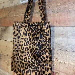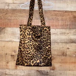 Stylish leopard print tote bag perfect for any occasion. Features a bold black and tan pattern. Ideal for adding a touch of wild elegance to your outfit.