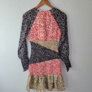 Foxiedox Long Sleeve Smocked Keyhole Floral Mini Dress. Size XS. New with tags. Smocking through torso. Tiered ruffle hem. Long blouson sleeves. Smocked cuffs. Keyhole front with button closure. Red, yellow, and black color blocking. Micro floral print. Lined. Original Msrp $149.