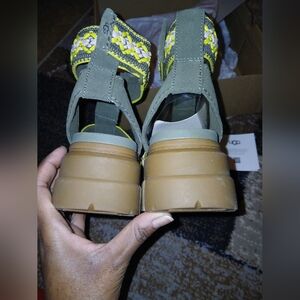 NWOT and box Ugg Ashton Heritage Braided Sandals. Sold out online! Olive Green with Brown Soles and Yellow and Baby Pink accents. Size 10.