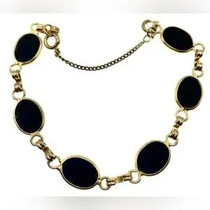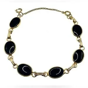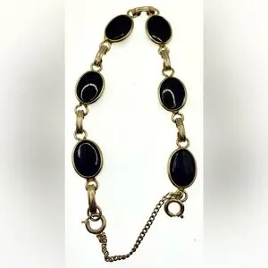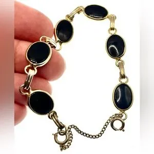 Vintage Gold Tone Linked Bracelet with Bezel Set Onyx Gems with Safety Chain. Spring Ring clasp. Good weight and quality. Minor signs of wear consistent with age. In good vintage condition. 7 3/4”. Very pretty.
