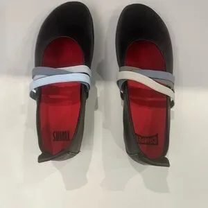 Size 5 Camper Black Flats with Blue and White Straps. No box. New without tags.