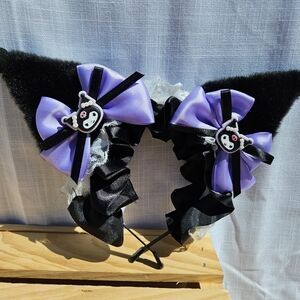 Adorable Kuromi headband featuring a purple and black bow design. Perfect for adding a playful touch to any outfit.