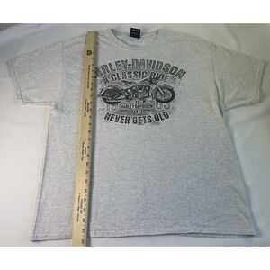 This is a vintage Harley-Davidson T-shirt in size XL. It features a graphic print of the Chi-Town logo and is made of a cotton blend material. The shirt has short sleeves and a crew neck, making it perfect for the summer, fall, and spring seasons. It is machine washable and has accents of the Harley-Davidson logo. This T-shirt is ideal for men who love motorcycles and want to show off their biker style.