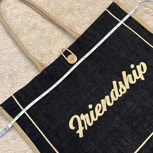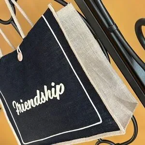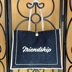 Beautiful. Chic. Fun “Friendship” tote beautifully designed with black and tan colors. Soft rope handles. Open top with front button closure. Open and spacious interior. Perfect gift to that awesome friend. Great for getaways too! Should you have any questions, please do not hesitate to ask. Thank you for visiting my closet. 💐