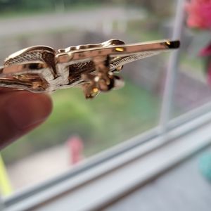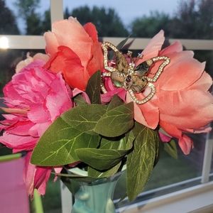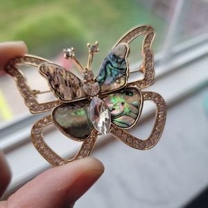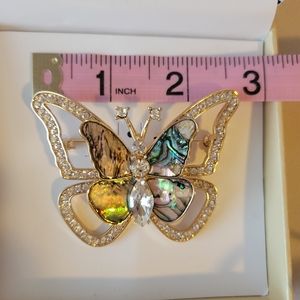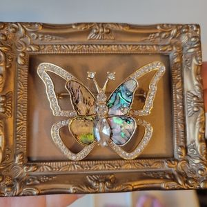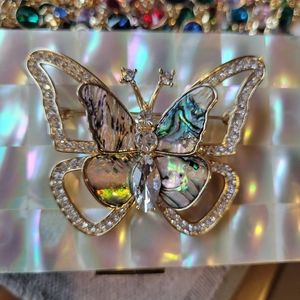 Pretty and shiny gold tone metal work with sparkly clear rhinestone wing outline and mesmerizing and ethereal abalone wings with more rhinestone accents for body.