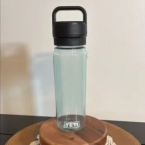 YETI clear water bottle with a sturdy black lid. Perfect for hydration on the go.