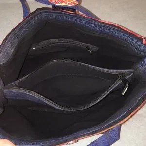 Inside of bag: large middle divider pocket w/ coin zip closure & small side wall zip pouch. Very versatile bag. Easy to clean with damp rag