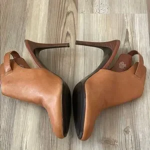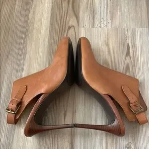 These elegant tan 4” mule heels from Lauren Ralph Lauren feature a sleek almond toe, perfect for adding a touch of sophistication to any outfit. Crafted from smooth leather, they boast an open back design with a stylish ankle strap for a secure fit.