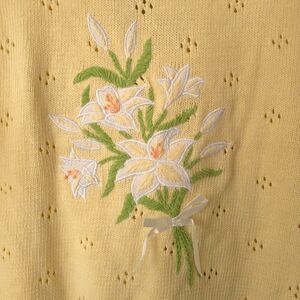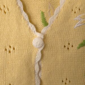 Features: Embroidered white flowers on a knit cardigan with soft buttons.