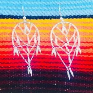No longer sold on site! Gorgeously shimmering silver drops suspend from delicate chains and a structured arch. Creating an almost mystical webbed Dreamcatcher ooE effect. Very unusual. Every slight movement bringing a magical glimmer to... your gorgeous face!!! As your jewels should do, dahling. But of course. Add movement to your look with these striking chandelier earrings.