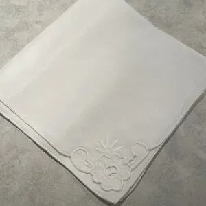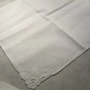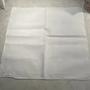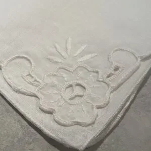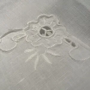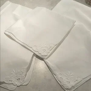 Set of (7) elegant white linen napkins with delicate embroidery. Beautiful set.