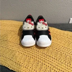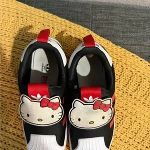 These Adidas kids shoes feature a fun Hello Kitty design. The black and white colors make them versatile for any outfit. Perfect for little ones who love comfort and style.