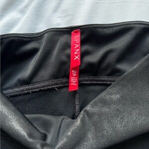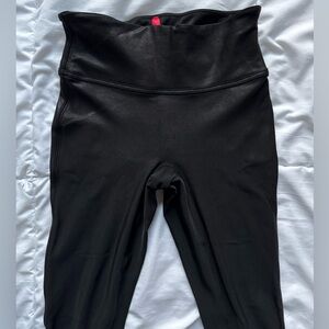 spanx faux leather high waisted sculpting leggings. elasticized waistband, bodycon fit, matte finish. 87% nylon, 13% elastane.
