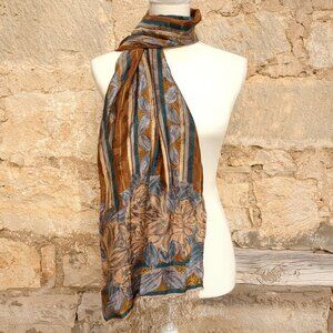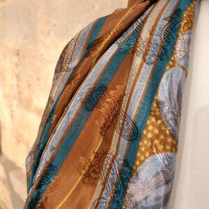 This lovely long scarf features colors of teal, brown, yellow, and gray. Having a cream/beige fringe, it also has tangible paisley patterns all along the scarf for a decadent look and feel.