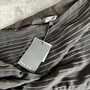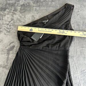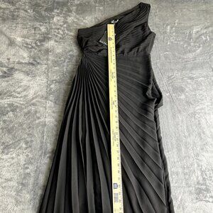 Add a touch of whimsy to your wardrobe with this Nicole Miller one-shoulder dress. The dress features a pleated satin fabric in a solid black color with an asymmetric hemline. It is perfect for any occasion, whether you're attending a party or running errands. The dress is an A-line style with a long length and a sleeveless design. The one-shoulder sleeve type adds a unique touch to the dress, making it perfect for those who love to stand out. The dress is made of lightweight polyester and spandex material, making it comfortable to wear in any season. The garment care instructions are to dry clean only.