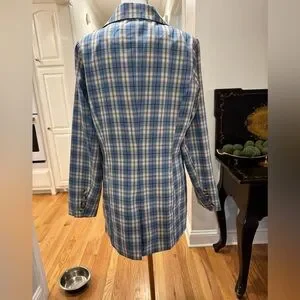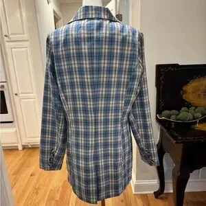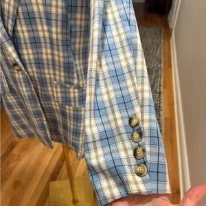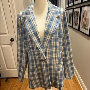 Elevate your style with this chic blue plaid women's blazer. Perfect for any occasion, this jacket offers a sophisticated look with its classic design. VICI plaid blue/tan blazer. Fully lined with faux front pockets size Large