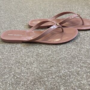 New Tory Burch pink “jelly” sandals, with a textured footbed for grip and comfort. Ideal for casual outings and beach days, they clean easily and travel well. With tory logo on the strap in a pretty pink/blush color. Women’s size 9.