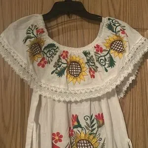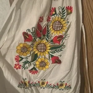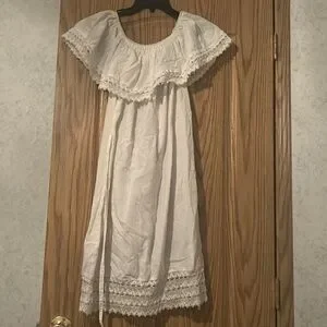 Beautiful white Mexican embroidered dress with lace around the base and swoop neck. Featuring delicately embroidered flowers and other red flowers. Super cute delicate dress in great condition some light wear. Small tag inside with the letter G on it. Would say it would probably be best for a medium.